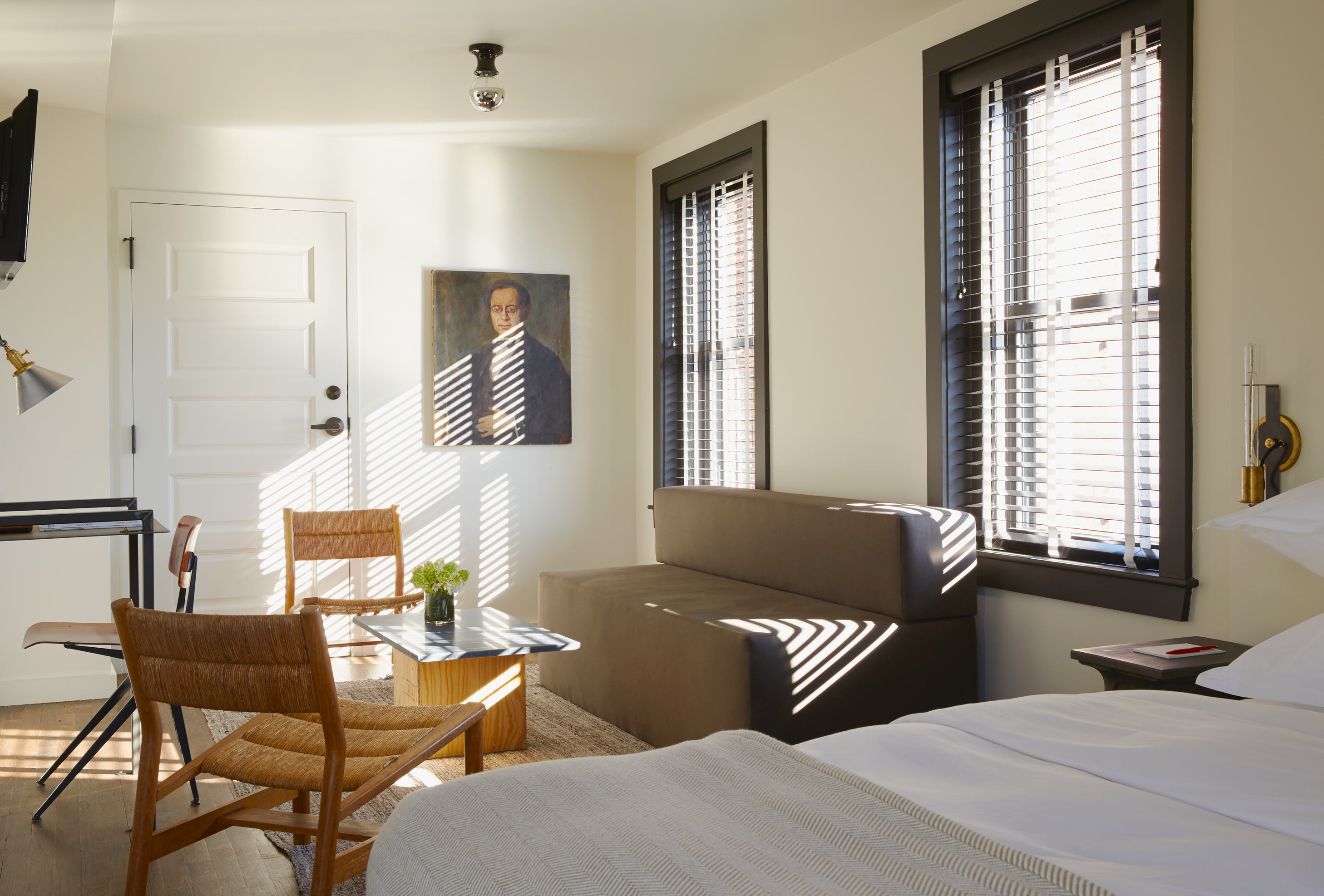 Four interconnected guest rooms on the private top floor of the hotel, with accommodations for up to ten. Two king suites and two queen rooms can be connected for seamless socializing. Two separate sitting areas allow for intimate moments. All rooms feature luxury linens, complimentary WiFi, two hundred premium TV channels, gourmet snacks, and a mix of custom and vintage furniture and original artwork, from European portraiture to prominent RISD photographers. The Heights includes four signature black bathrooms complete with rainshowers and toiletries made exclusively for The Dean.