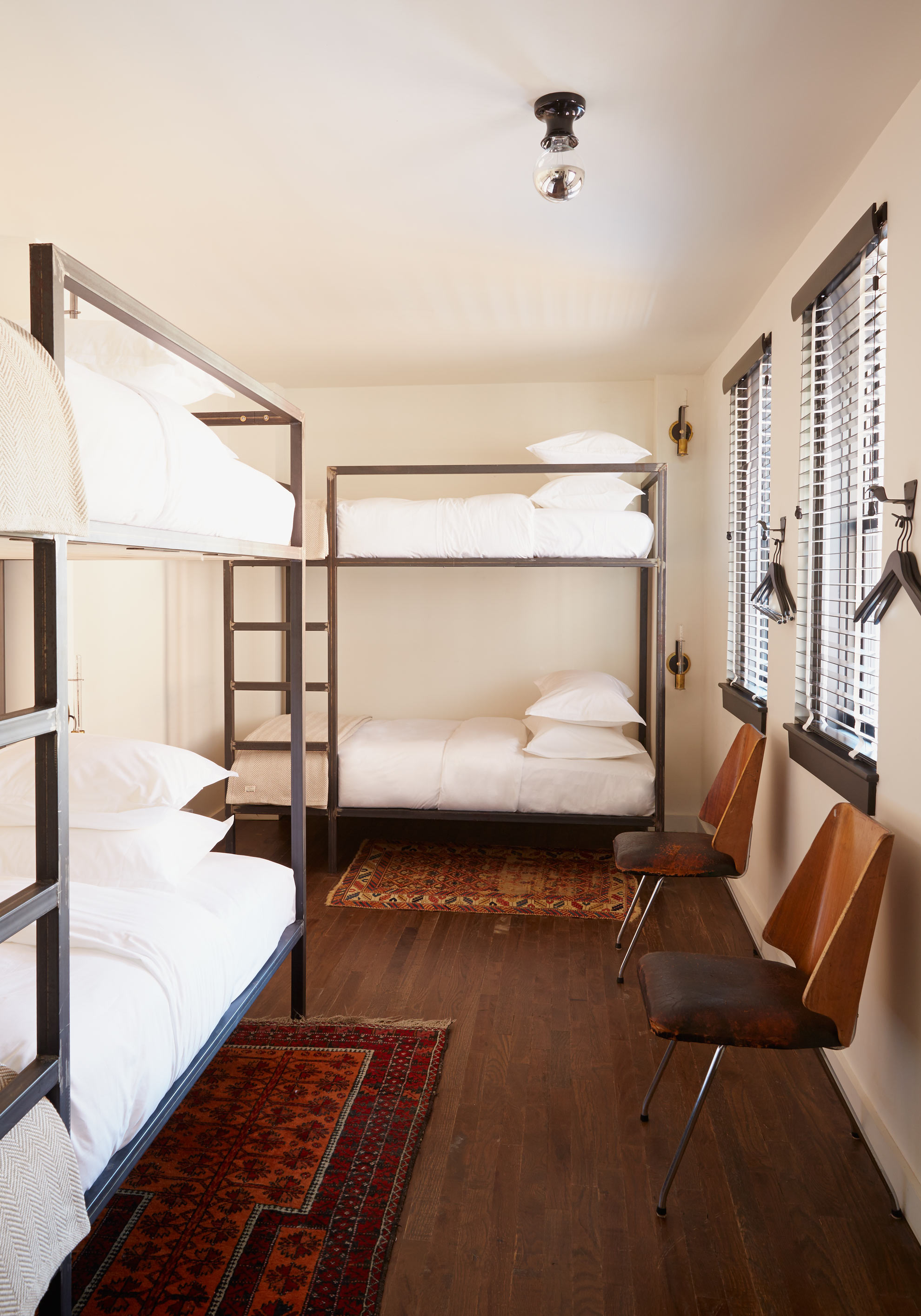 Room for four, featuring a pair of bunks with four twin beds. All rooms feature luxury linens and a mix of custom and vintage furniture and original artwork, from European portraiture to prominent RISD photographers. The Classmates includes a writing desk, complimentary WiFi, two hundred premium TV channels, gourmet snacks, hanging storage and ample seating, along with a signature black bathroom complete with rainshower and toiletries made exclusively for The Dean.
